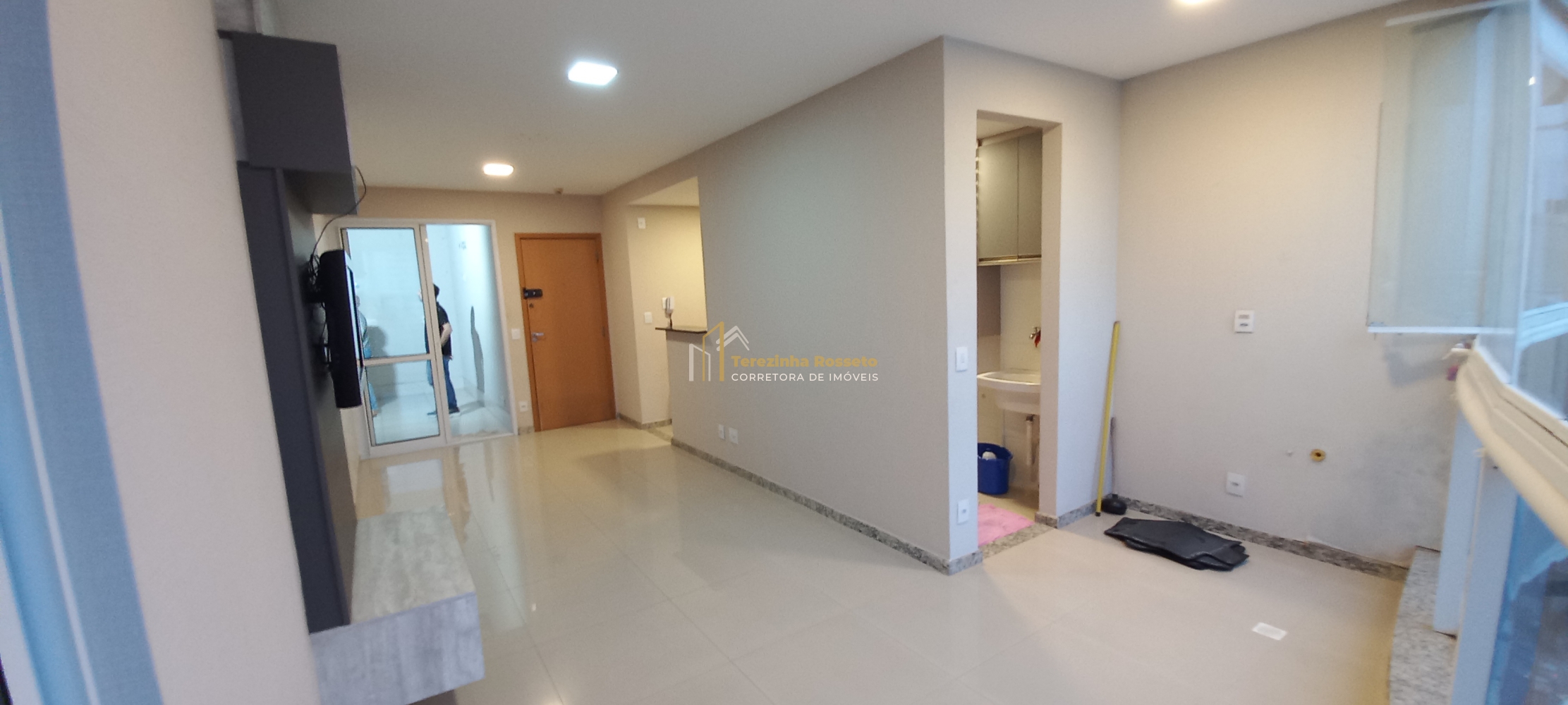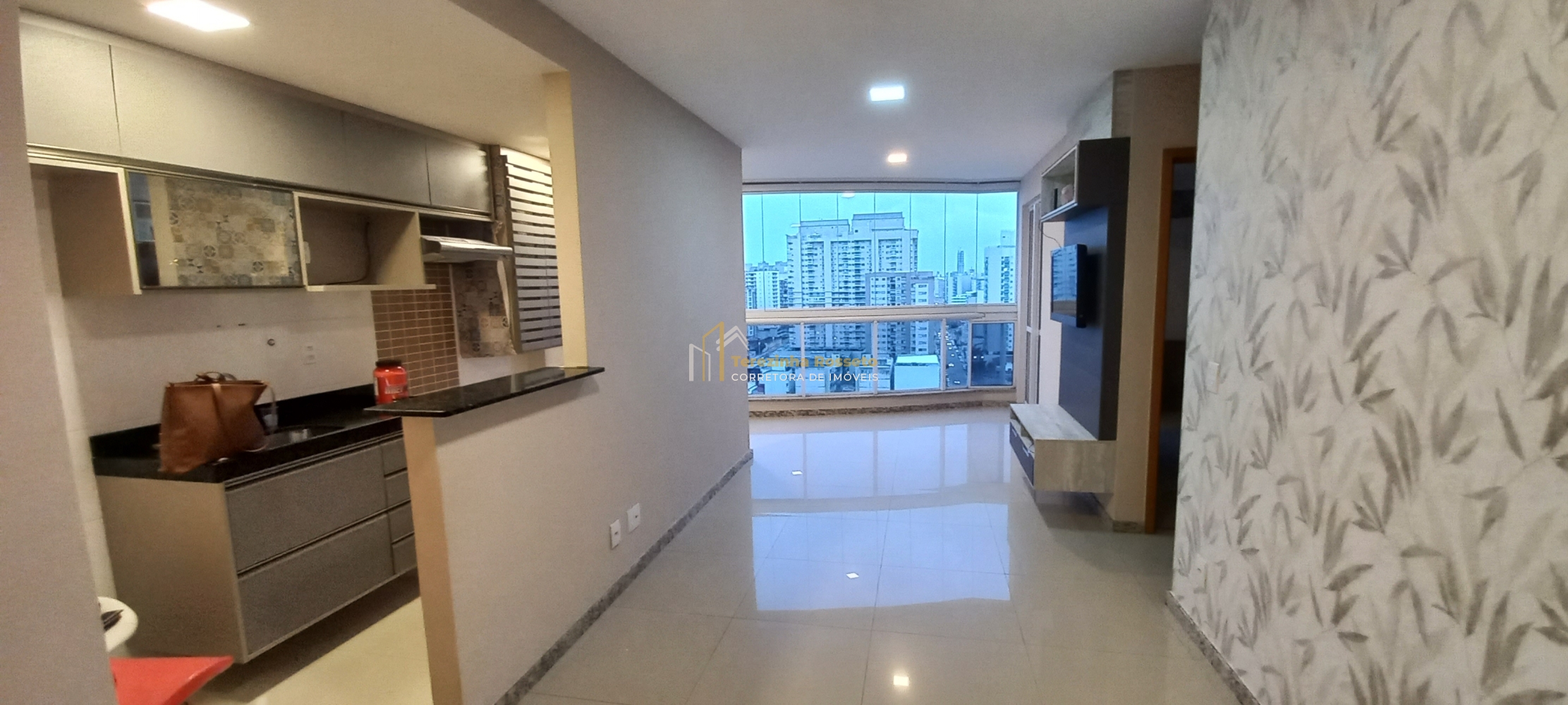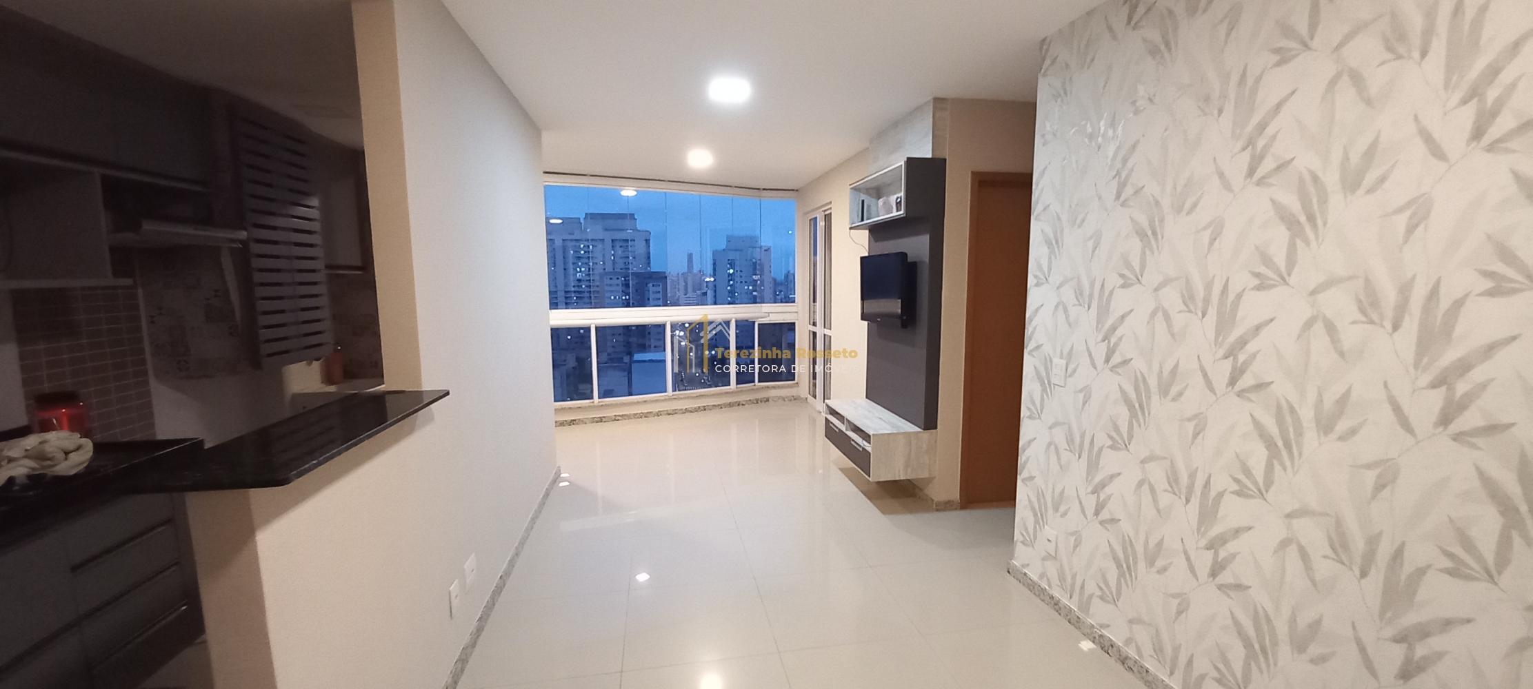 Sala grande com papel de parede, painel para TV, integrado sala de jantar,