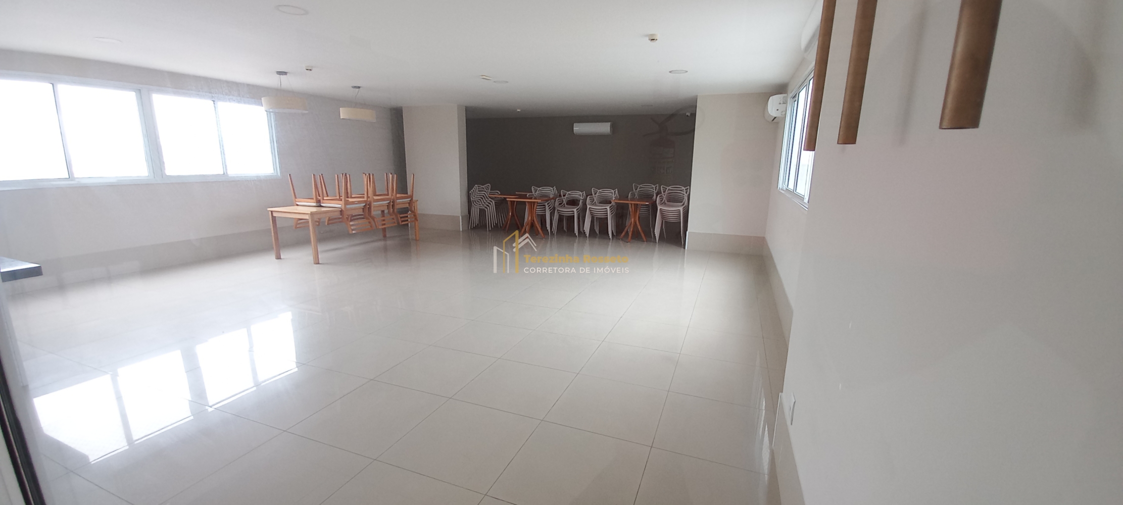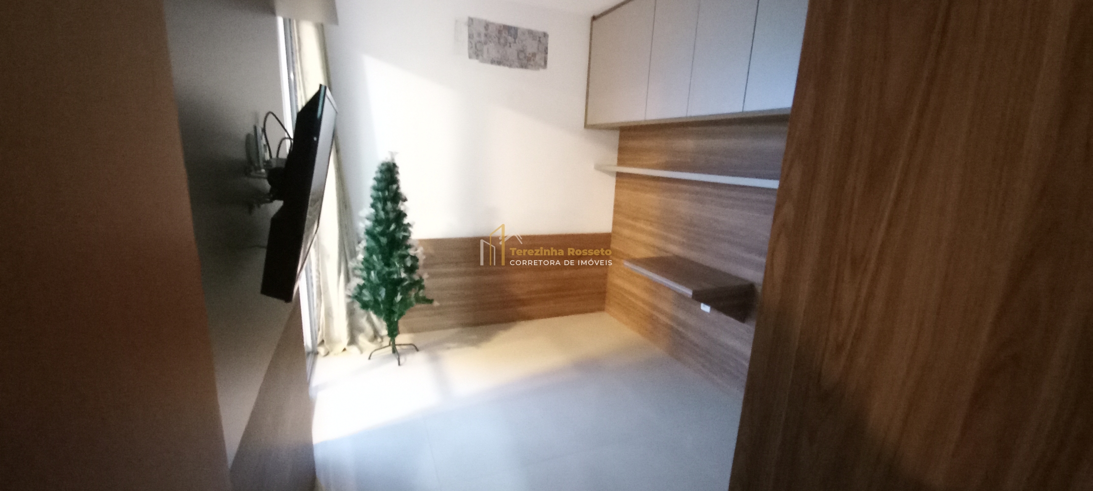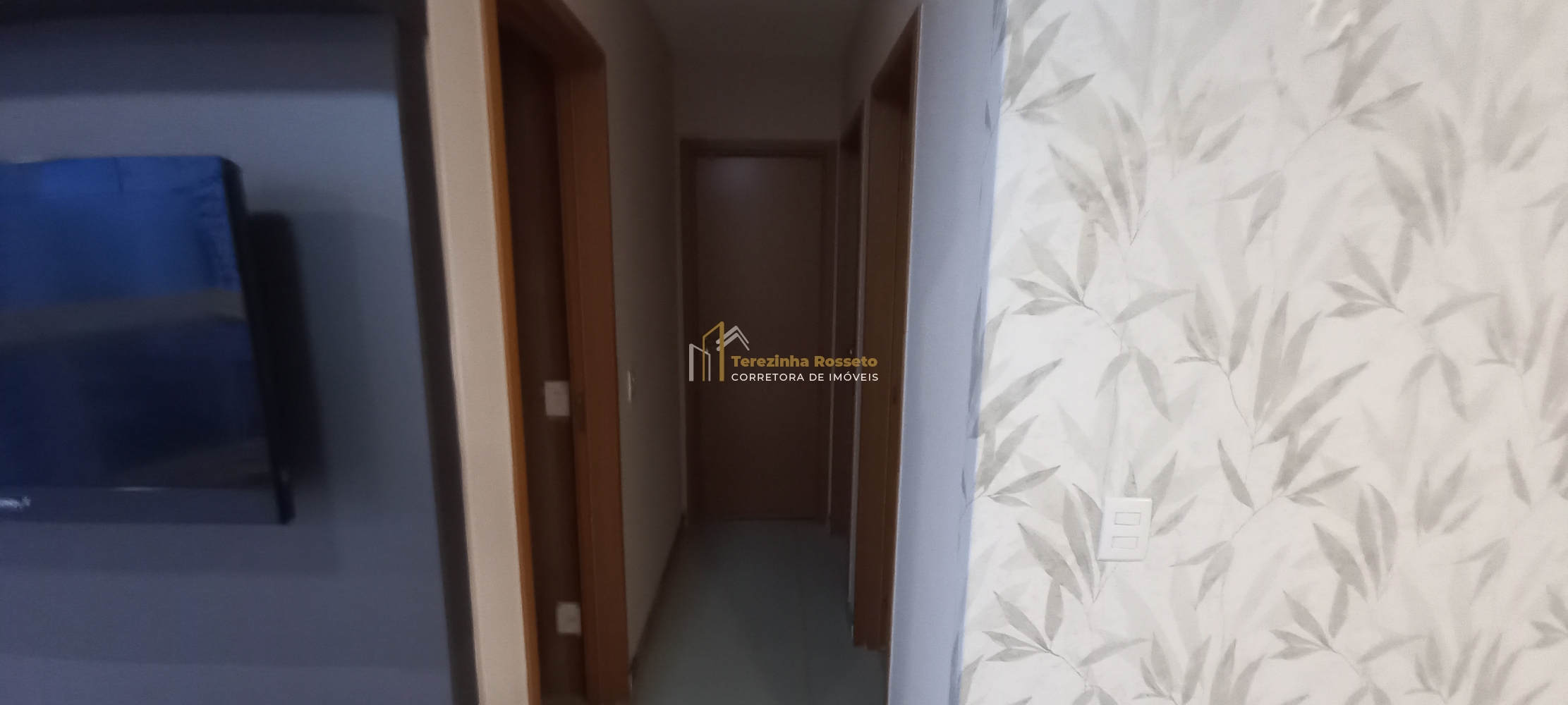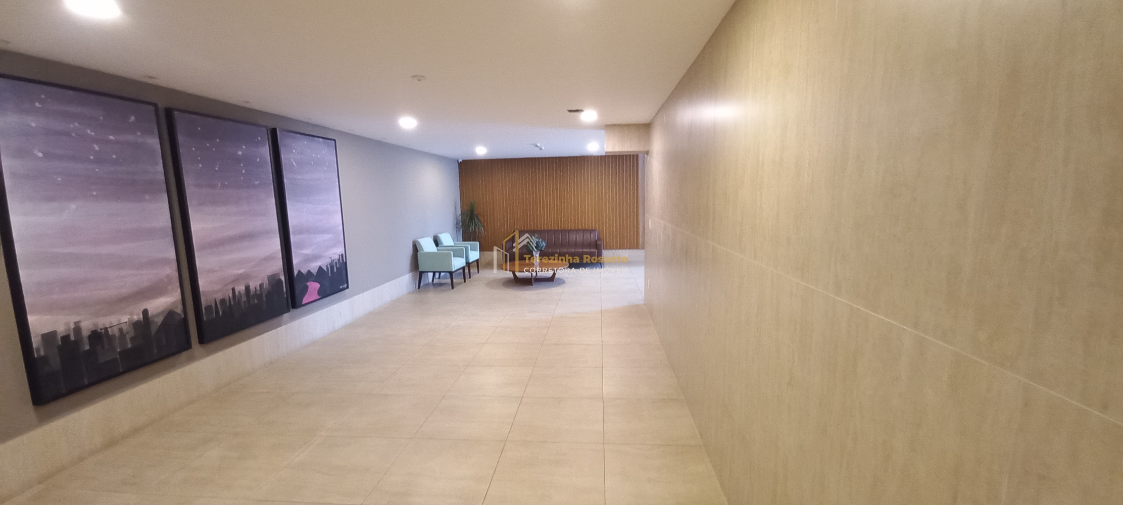 Sala grande com papel de parede, painel para TV, integrado sala de jantar,